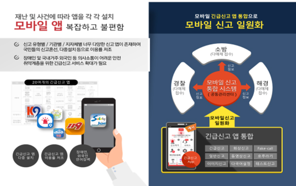 행정안전부는 경찰과 소방, 지자체 등에서 운영하고 있는 모바일 앱을 통합하는 ‘긴급신고 통합 서비스 고도화 사업’을 추진한다고 밝혔다.