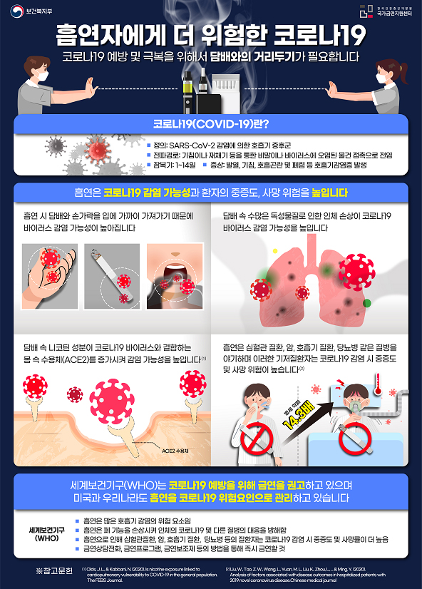 흡연을 하면 담배와 손가락에 입이 닿게 되므로 바이러스가 흡연자의 입과 호흡기로 들어갈 가능성이 높아지며 흡연으로 흡입하는 독성물질은 심혈관, 폐, 면역 기능을 손상시켜 코로나19 감염 가능성을 높인다.