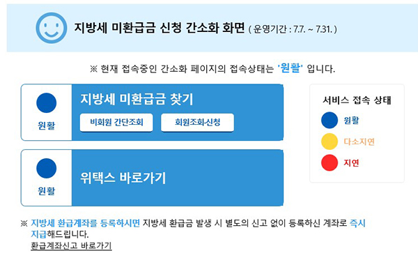 한편 미수령 환급금은 스마트 위택스(모바일)와 정부24(http://www.gov.kr)의 ‘나의 생활정보’에서도 확인할 수 있으며, 인터넷 사용이 불편한 경우 관할 시군구 세무부서에 문의하면 쉽게 확인 가능하다.