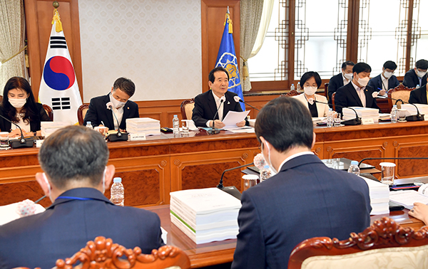 정세균 국무총리가 6일 정부서울청사에서 열린 규제자유특구위원회를 주재하고 있다.이번에 새로 지정된 특구는 부산(해양모빌리티), 대구(이동식 협동로봇), 울산(게놈서비스산업), 강원(액화수소산업), 충남(수소에너지 전환), 전북(탄소융복합산업), 경북(산업용헴프)이다.