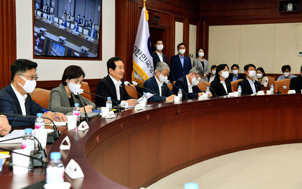 16일 서울 세종로 정부서울청사에서 정세균 국무총리 주재로 국정현안점검조정회의가 열리고 있다.이는 지난 14일 발표한 ‘한국판 뉴딜 종합계획’ 후속조치의 일환으로 추진된다.