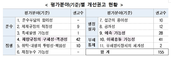 이번 개선권고의 주요 분야는 과도한 재량권 행사를 통제해 부패행위를 방지하기 위한 재량규정의 구체화 및 객관화(42건, 27.1%), 공적 업무 추진과정에서 사적 이해의 개입을 방지하기 위한 이해충돌방지 장치 마련(41건, 26.5%), 국민의 법적 안정을 보장하기 위한 예측가능성 제고(28건, 18.1%) 등이다.