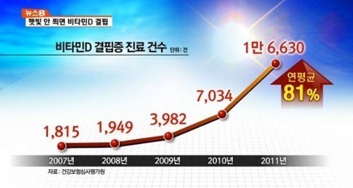 7일 건강보험심사평가원의 최근 5년간 심사결정자료를 살펴보면 ‘비타민D 결핍’의 진료인원은 2010년 3118명에서 2014년 3만 1225명으로 4년간 약 3만명이 늘었다. 10배 가량 증가한 셈이다.