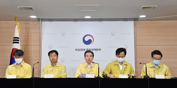 김용범 기획재정부 1차관이 23일 정부서울청사에서 ‘제10차 비상경제 중앙대책본부 회의’ 결과 브리핑을 하고 있다. 왼쪽부터 최훈 금융위원회 상임위원, 강경성 산업통상자원부 산업정책실장, 김용범 차관, 강성천 중소벤처기업부 차관, 양충모 기획재정부 재정관리관.(사진=기획재정부)중소벤처기업부는 23일 정부서울청사에서 열린 ‘제11차 비상경제 중앙대책본부회의 겸 제1차 한국판 뉴딜 관계장관회의’에서 이 같은 내용을 담은 ‘AI·데이터 기반 중소기업 제조혁신 고도화 전략’을 발표했다.