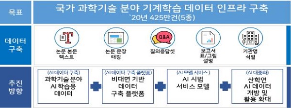 국내논문과 국가R&D보고서 원문을 대상으로 과학기술분야 기계학습 데이터 5종을 구축하며 최대 425만여 건의 과학기술 기계학습 데이터가 사업물량이다.