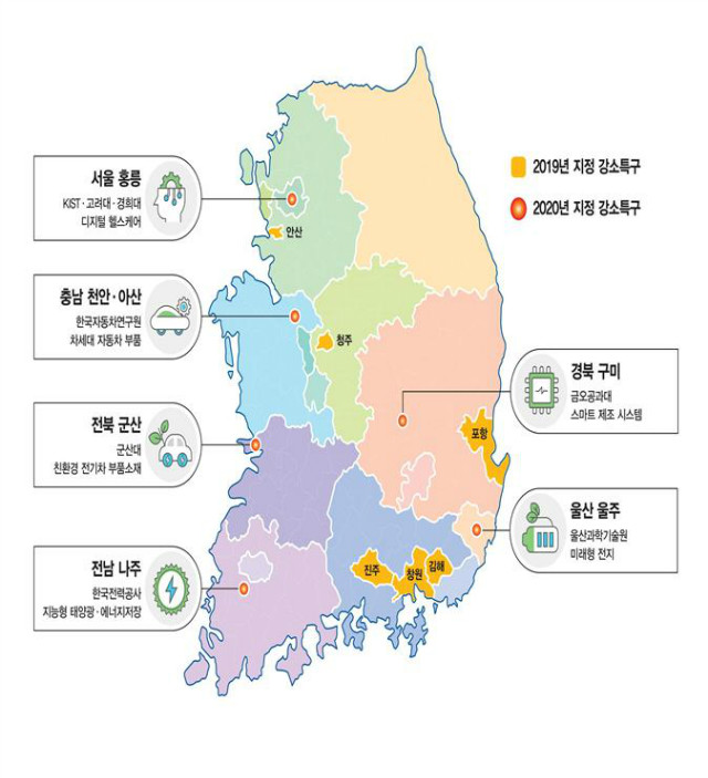 신규 지정된 6개 강소특구 지정도.과학기술정보통신부는 27일 제34차 연구개발특구위원회를 열고 경북 구미, 서울 홍릉, 울산 울주, 전남 나주, 전북 군산, 충남 천안·아산 등 6개 지역 일원을 강소특구로 신규 지정했다고 밝혔다.