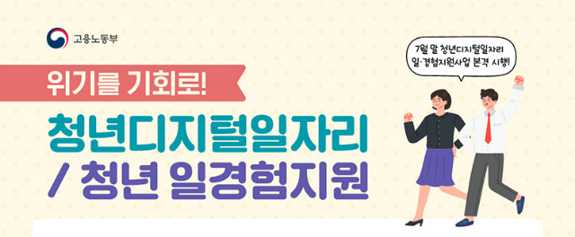 [일간환경연합 장민주 기자]30일부터 기업의 ‘청년 디지털 일자리 사업’과 ‘청년 일경험 지원 사업’ 참여신청 접수(http://www.work.go.kr/youthjob)가 시작된다.