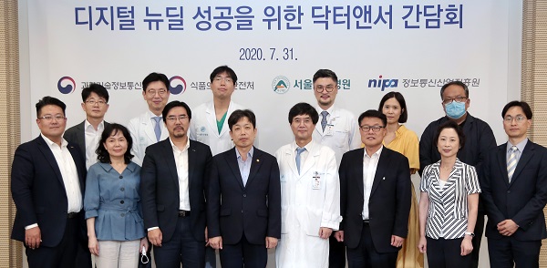 과학기술정보통신부와 식품의약품안전처가 31일 오전 서울 송파구 서울아산병원에서 ‘디지털 뉴딜 성공을 위한 닥터앤서 간담회’를 개최했다. 장석영 과학기술정보통신부 제2차관을 비롯한 간담회 참석자들이 기념촬영 하고 있다. (사진=서울아산병원)과학기술정보통신부와 식품의약품안전처는 31일 서울아산병원에서 디지털 뉴딜 성공을 위한 간담회를 개최하고 국내 기술로 개발된 인공지능 의료 소프트웨어(SW) ‘닥터앤서’의 신속한 의료기기 인허가를 지원하기 위한 협력방안을 논의했다.