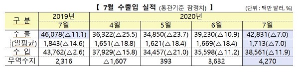 3일 산업통상자원부가 발표한 ‘7월 수출입동향’에 따르면 지난달 수출은 428억3000만달러(약 51조105억원)로 전년 동월 대비 7% 감소했다. 수출액도 3월 이후 4개월만에 처음으로 400억달러 대를 회복, 코로나19 이전인 1분기 평균 수출액(434억달러) 수준으로 회복됐다.