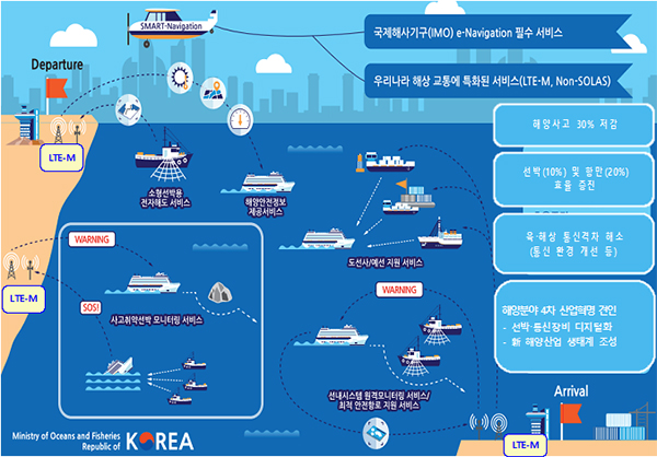 스마트 해양교통체계 도입을 위한 핵심 세부과제로 한국형 해상 내비게이션(e-Navigation) 서비스가 진행된다.