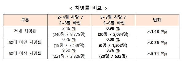 5∼6월에 확진된 60대 이상 신규 확진자 가운데 7월까지 사망한 사람의 비율은 3.76%로, 2∼3월에 확진된 이후 4월까지 사망한 비율(9.5%)보다 무려 5.74%p 낮아졌다.