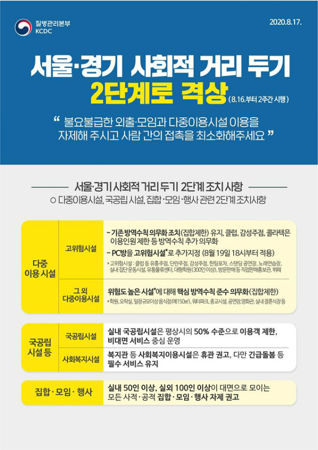 서울·경기 지역에 대하여 사회적 거리두기를 2단계로 상향합니다.
