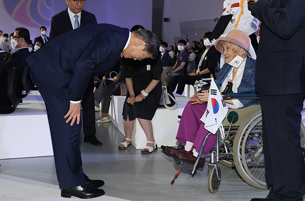 문재인 대통령이 15일 오전 서울 동대문디자인플라자에서 열린 제75주년 광복절 경축식에서 독립유공자 고 최사진 씨의 배우자 박명순 씨에게 대통령 표창을 수여한 후 인사하고 있다.(사진=(c) 연합뉴스)