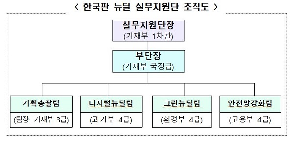 지원단 단장은 기재부 1차관이 겸임하며, 기획총괄팀, 디지털뉴딜팀, 그린뉴딜팀, 안전망강화팀 총 4개 부서, 관계부처 파견 등 20여명의 인력으로 구성했다.