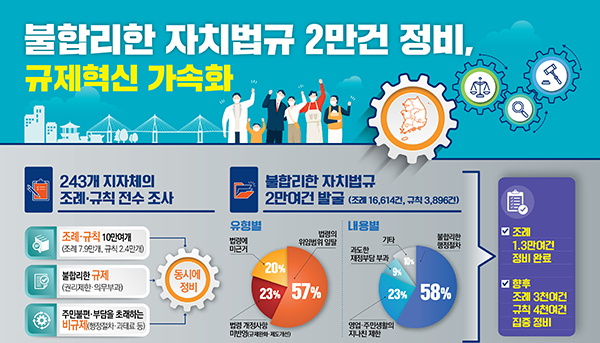 이를 통해 불합리한 자치법규 총 2만여건을 발굴했는데, 유형별로는 ▲법령 위임범위 일탈(57%) ▲법령 개정사항 미반영(23%) ▲법령 미근거(20%)등이며 내용별로는 ▲불합리한 행정절차(58%) ▲영업·주민생활의 지나친 제한(23%) ▲과도한 재정부담 부과(9%)등으로 나타났다.