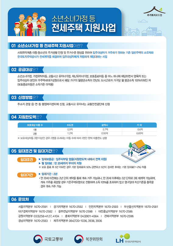 소년소녀가정 지원사업은 소년소녀가정, 가정위탁아동, 교통사고유자녀가정, 아동복지시설 퇴소자를 대상으로 아동의 보호기간 또는 만 20세까지 전세자금을 무상 지원하는 사업이다.