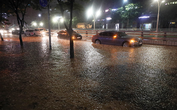 부산지역에 호우 경보가 내려진 7월 23일 오후 부산 해운대구 센텀시티에서 차량이 침수된 도로 위에 멈춰 서 있다. (사진(c) 연합뉴스)환경부는 기후변화에 따른 집중호우에 대응하기 위해 오는 2025년까지 인공지능(AI)을 활용한 홍수예보 시스템을 도입할 방침이다.