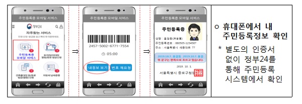 행정안전부 주민과의 사업안으로 주민등록증 기재사항(생년월일, 사진, 주소, 발급기관, 일자 등)을 주민등록시스템을 통해 모바일로 확인해 주는 서비스다. 언제 어디서나 스마트폰으로 내 주민등록정보 확인 가능해 주민등록증 소지·제시 관련 불편함 및 분실위험 감소, 분실·훼손 재발급 비용 절감이 연 100억원에 달할 것으로 추정했다. 사업비로 22억 4000만원이 편성됐다.
