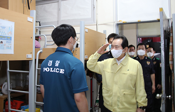 정세균 국무총리가 지난 8월 21일 서울 중구 신당동 서울지방결찰청 기동본부를 방문해 생활실을 둘러보며 근무자들을 격려하고 있다. (사진=(c) 연합뉴스)먼저 중앙부처에는 경찰 및 해양경찰 3393명, 국공립 교원 3613명, 생활·안전 공무원 등에 1339명으로 총 8345명을 충원한다.