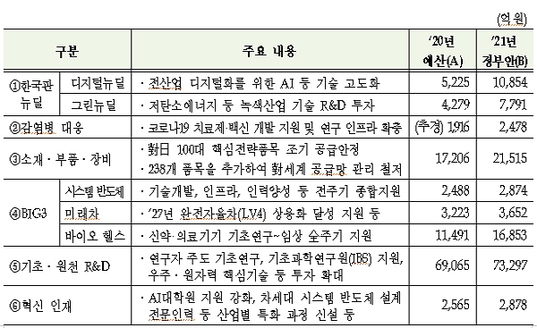 이에 따르면 내년 R&D 예산은 올해 24조 2000억원 보다 12.3% 증액한 27조 2000억원으로 편성하고 13조 2000억원을 한국판 뉴딜, 감염병, 소부장, BIG3, 기초 원천R&D, 인재양성의 6개 분야에 집중 투자키로 했다. 이로써 6개 분야 R&D 예산은 올해 11조원보다 20.1% 늘어나게 된다.