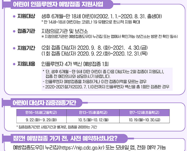 이 외에 1회 접종 대상 어린이는 긴 인플루엔자 유행기간 동안 충분한 면역력 유지를 위해 22일부터 무료 예방접종을 시작할 계획이다.