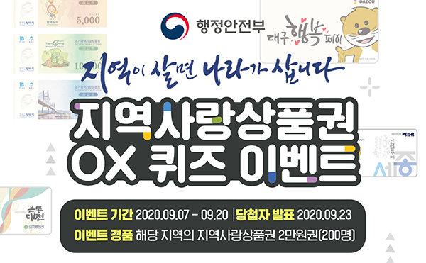[일간환경연합 한선미 기자]행정안전부는 다가오는 민족 대명절 추석을 맞이해 ‘지역사랑상품권’을 증정하는 이벤트를 20일까지 진행한다고 밝혔다.