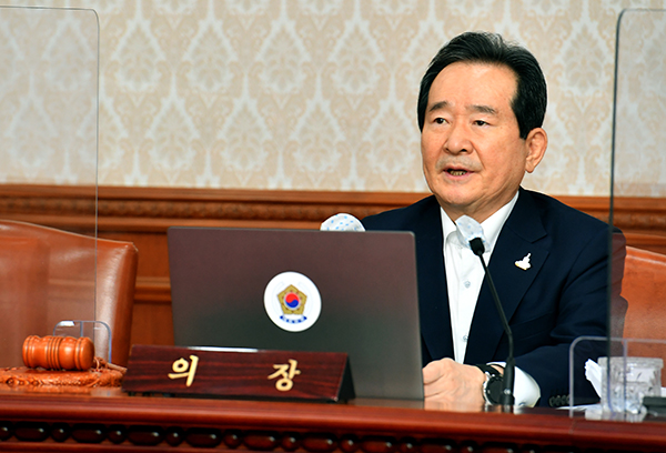 정세균 국무총리가 23일 정부서울청사에서 열린 임시국무회의를 주재하고 있다.정 총리는 “손님의 발길이 끊긴 소상공인과 자영업자는 절박하다. 폐업할 여력도 없다고 호소하고 있다”며 “힘겹게 고용을 유지해 온 기업들과 소득이 급감한 노동자, 실낱같은 취업의 가능성을 놓지 않았던 구직자와 근근이 버텨온 저소득층도 이제는 한계상황”이라고 설명했다.