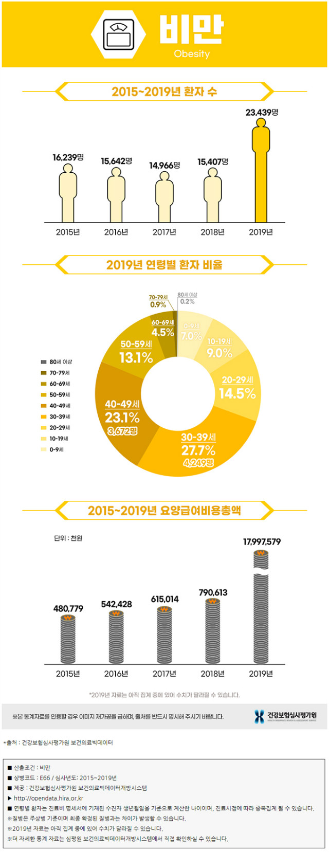 건강보험심사평가원의 통계에 따르면 비만으로 병원을 찾은 환자 수는 2018년까지 큰 변동이 없었지만, 2019년에 2018년 대비 무려 52% 증가한 2만 3439명이 됐습니다. 2019년 환자를 연령별로 보면 30세 이상 환자가 약 70%를 차지했는데요. 30대가 27.7%로 4249명, 40대 환자가 23.1%로 3672명이었습니다.