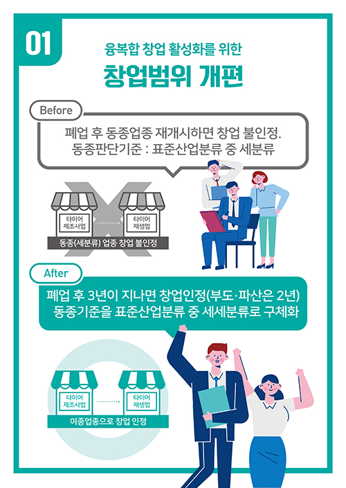 또 디지털 경제 시대를 맞아 연쇄창업과 융복합 형태의 다양한 사업모델 등을 창업으로 인정하기 위해 동종업종의 판단기준을 표준산업분류상 기존의 ‘세분류(4번째 자리)’에서 ‘세세분류(5번째 자리)’로 개편해 창업으로 인정되는 경우를 확대했다.