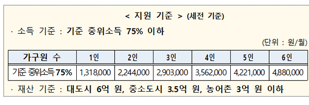 지원대상은 코로나19로 인한 실직·휴폐업 등으로 소득이 25% 이상 감소해 생계가 곤란하지만 기초생활보장 생계급여 등 기존 복지제도나 긴급고용안정지원금, 소상공인새희망자금 등 다른 코로나19 피해지원 프로그램으로 지원받지 못하는 코로나19 피해 가구로 소득 기준은 기준 중위소득 75% 이하, 재산 기준은 대도시 6억 원, 중소도시 3억 5000만 원, 농어촌 3억 원 이하다.