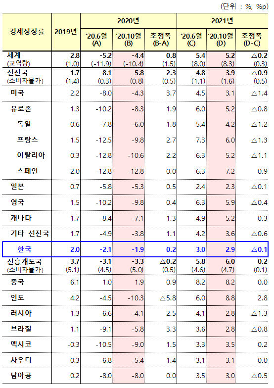 IMF는 13일(미국 워싱턴 현지시간) 발표한 ‘10월 세계경제전망(World Economic Outlook)’ 보고서에서 최근 각국의 빠른 경제활동 정상화를 반영해 올해 세계 경제성장률 전망치를 -4.4%로 지난 6월보다 0.8%p 상향 조정하면서 한국 경제 성장률 전망치도 0.2%p 올렸다.