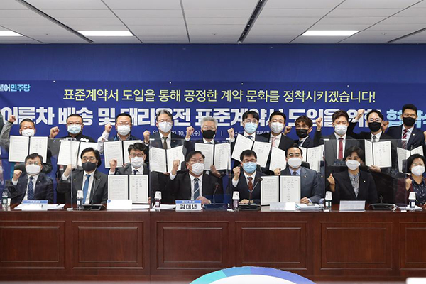 국토교통부는 이륜차 배송(퀵서비스·배달)·대리운전 업계, 노동계 및 더불어민주당 을지로위원회와 14일 국회 의원회관에서 ‘이륜차 배송 및 대리운전 표준계약서 도입을 위한 협약’을 체결했다고 밝혔다.