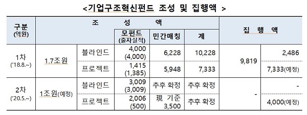 1차 기업구조혁신펀드는 12개 하위펀드를 약 1조 7000억원 규모로 조성했으며, 20개 기업에 약 9819억원의 투자를 집행했다.