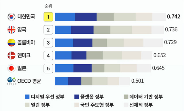 OECD 사무국은 이번 보고서에서 “한국과 영국 등 상위권을 차지한 국가들은 정부 정책의 중심에 ‘디지털정부’를 두고 범정부적 개혁을 적극적으로 추진하고 있다”며 이번 평가가 이러한 사실을 반영한 결과라고 밝혔다.
