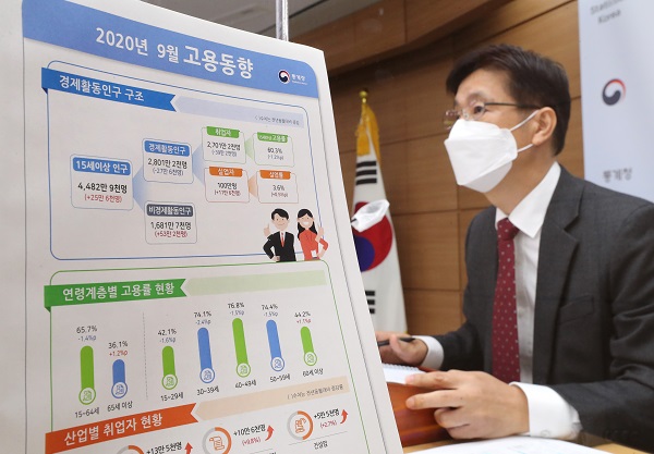 [일간환경연합 한선미 기자]9월 취업자수가 코로나19 재확산 영향으로 전년동월대비 39만2000명이 감소한 것으로 나타났다.
