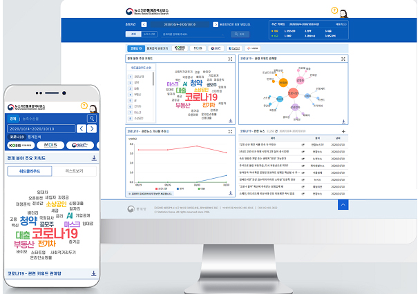 ‘뉴스 기반 통계 검색 서비스’는 온라인에서 수집한 뉴스 빅데이터를 기반으로 경제와 농축수산물 부문에 대한 키워드 분석 결과와 해당 키워드에 대한 통계 자료를 국가통계포털(KOSIS)·마이크로데이터 통합 서비스(MDIS)·통계지리정보(SGIS) 등 통계청의 대표 통계 서비스에서 검색할 수 있는 기능을 제공한다.