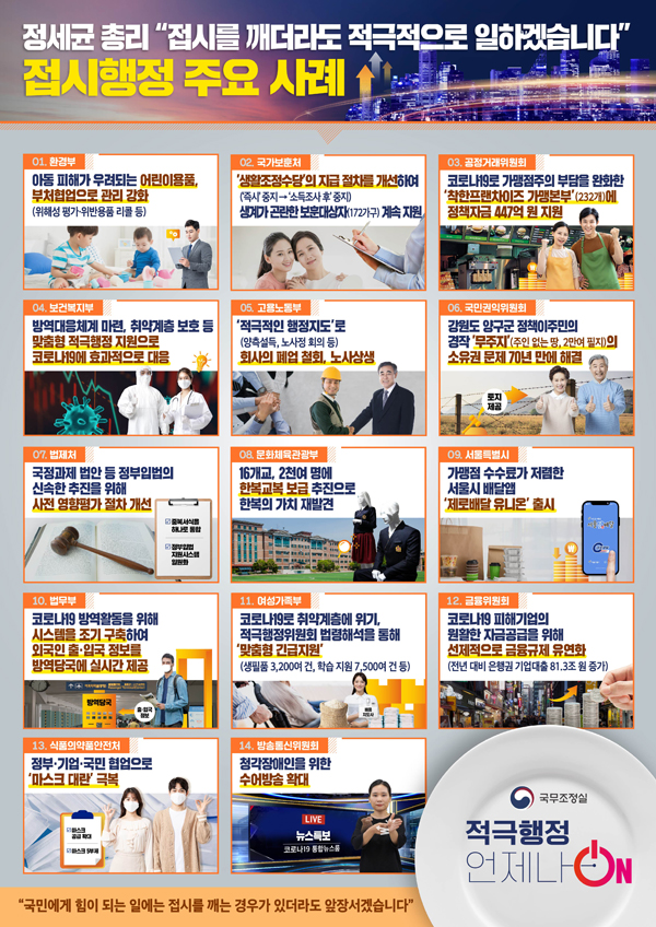 차관회의를 주재한 구윤철 국무조정실장은 “정세균 총리는 일하다가 접시를 깨는 것은 괜찮지만 일하지 않아 접시에 먼지가 쌓여서는 안된다고 항상 강조한다”며 “실패를 두려워하지 않고 적극적으로 일을 처리한 소위 ‘접시행정’ 사례는 의미가 크고 공직사회 곳곳에서 다양한 접시행정이 나오도록 차관들이 직접 챙겨달라”고 당부했다.