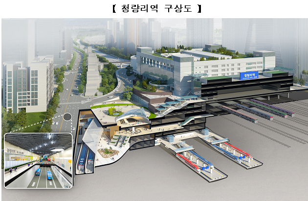 지상부 교통체계는 현재 청량리역 앞 왕산로에 밀집돼 있는 버스정류장을 환승센터 중심으로 재편, 버스와 철도 간의 환승동선을 줄이고 지상부의 교통혼잡과 보행자 안전도를 획기적으로 개선한다.