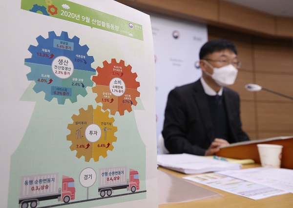 9월 전산업 생산은 광공업·서비스업 생산이 모두 증가하며 7월 –0.1%, 8월 –0.8%에 이어 2개월만에 증가세로 전환했고 광공업 생산(5.4%)은 수출개선 등에 힘입어 자동차(13.3%), 반도체(4.8%) 등 대부분 업종에서 증가하며 전산업 생산 회복세를 견인했다.