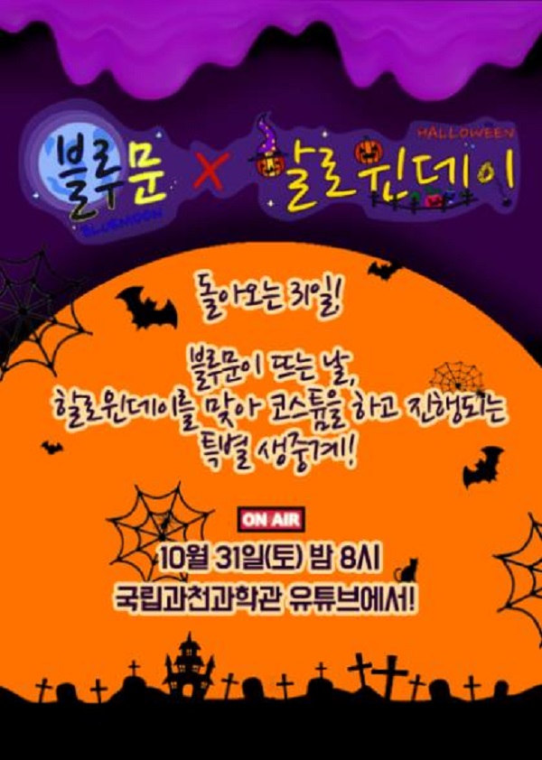 국립과천과학관 천체관측소의 망원경에 연결한 카메라로 보름달을 실시간으로 관측하고 핼로윈 캐릭터 분장을 한 출연자들이 블루문과 핼로윈데이의 의미와 기원 등을 설명할 예정이다.