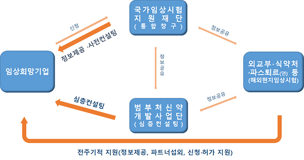 국내 환자 수 부족 등과 관련해 기업의 해외 임상도 적극 지원하는데, 희망 기업에 대해 관련 정보 및 상담·컨설팅을 제공하고 임상 진입 임박 기업에 대해 대면·심층 컨설팅(범부처신약개발사업단)을 통해 맞춤형 해외 임상 전략 수립을 지원한다.