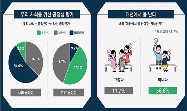 또한 속담을 활용한 설문에서 ‘팔은 안으로 굽는다’ 66.1%, ‘개천에서 용난다’ 11.7%로 나타나 ‘제 식구 감싸기’, ‘금수저·흙수저’ 문화는 아직 남아있다고 인식하고 있었다.
