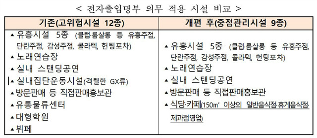 이에 따라 기존에는 12개 고위험시설이 전자출입명부 의무 적용대상이었으나, 7일부터는 150㎡ 이상의 식당과 카페 등 9종의 중점관리시설에서 전자출입명부 사용이 의무화되며 일반관리시설 등에는 활용을 권고한다.