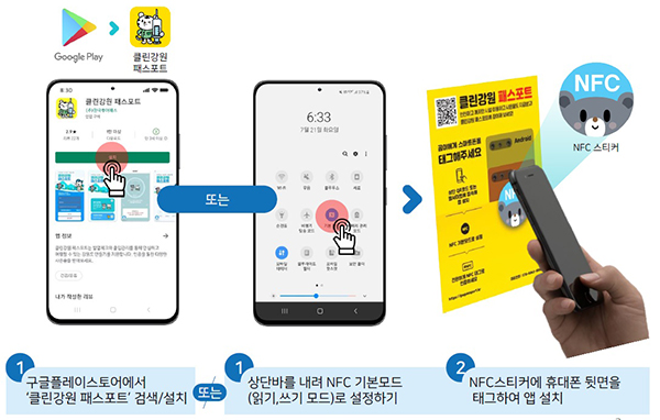 한편 강원도는 코로나19 확산 방지를 위한 수기명부 작성이 의무화됐으나 허위명부 작성이 빈번히 발생해 역학조사가 제대로 이루어지지 못하고 감염병 확산으로 지역상권은 더욱 어려워짐에 따라 기존에 운용하던 스탬프 투어 공공앱을 응용·고도화해 지난 4월 말 전국 최초로 전자출입명부 시스템인 ‘클린강원 패스포트’를 개발·적용했다.