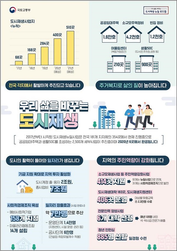 [일간환경연합 장민주 기자]정부는 지난 2017년 68곳을 시작으로 매년 100여 곳의 도시재생뉴딜사업을 선정, 올해 11월 현재까지 181개 지자체에서 총 354곳의 사업이 전국 각지에서 활발하게 진행되고 있다.