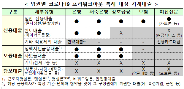 개인사업자가 개인 명의로 받은 가계 신용대출과 근로자햇살론, 햇살론, 바꿔드림론, 안전망대출 등 보증부 정책서민금융대출 및 사잇돌대출 등이 특례적용된다.