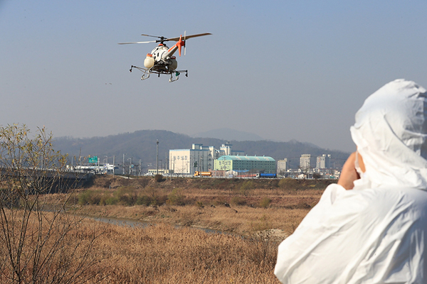 농림축산식품부 관계자가 26일 충북 청주시 미호천에서 방제 차량 및 인력이 닿지 않는 지역에 무인 방제헬기를 이용한 조류인플루엔자(AI) 방제활동을 하고 있다.(사진=농림축산식품부)현재 국내 철새도래지에서는 7건의 고병원성 조류인플루엔자 항원이 검출되고 있다.