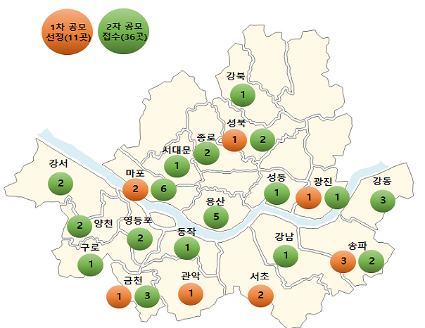 2차 공모는 지난달 26일까지 접수를 진행한 결과 총 36곳이 접수했다. 1차 공모에는 신청하지 않았던 4개의 자치구(용산·강동·양천·종로구)에서 새롭게 참여하는 등 공모에 대한 관심이 점차 확산되고 있는 것으로 나타났다.