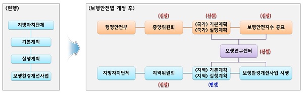 먼저 행정안전부 장관이 관계 중앙행정기관의 장, 특별시장 등과 협의 후 중앙 보행안전편의증진위원회의 심의를 받아 5년마다 국가 보행안전 및 편의 증진 기본계획과 연차별 실행계획을 수립할 수 있는 근거를 마련했다. 현재는 지방자치단체에서만 보행안전 계획을 수립 중이다.