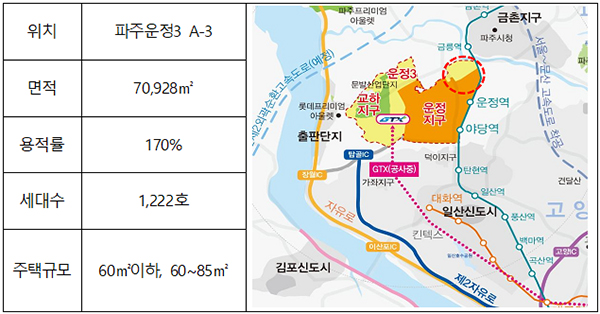 파주 운정3 A-3블록에서는 총 7만 928㎡ 부지에 전용면적 60㎡ 이하와 60~85㎡ 공동주택 1222가구가 공급된다.